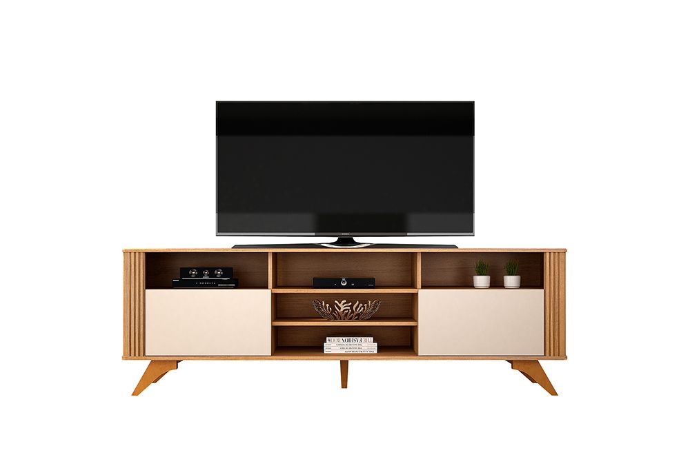 | Diferencial | • Prateleira com 25 mm • Painel em MDF fresado • TV de até 65" • Tampo e base em MDF com bordas arredondadas e laqueadas • Pés em madeira maciça • Molduras laterais em MDF revestido com detalhe fresado • Portas com puxadores cava 45° e pistão a gás • Nicho decorativo/aparelhos eletrônicos |